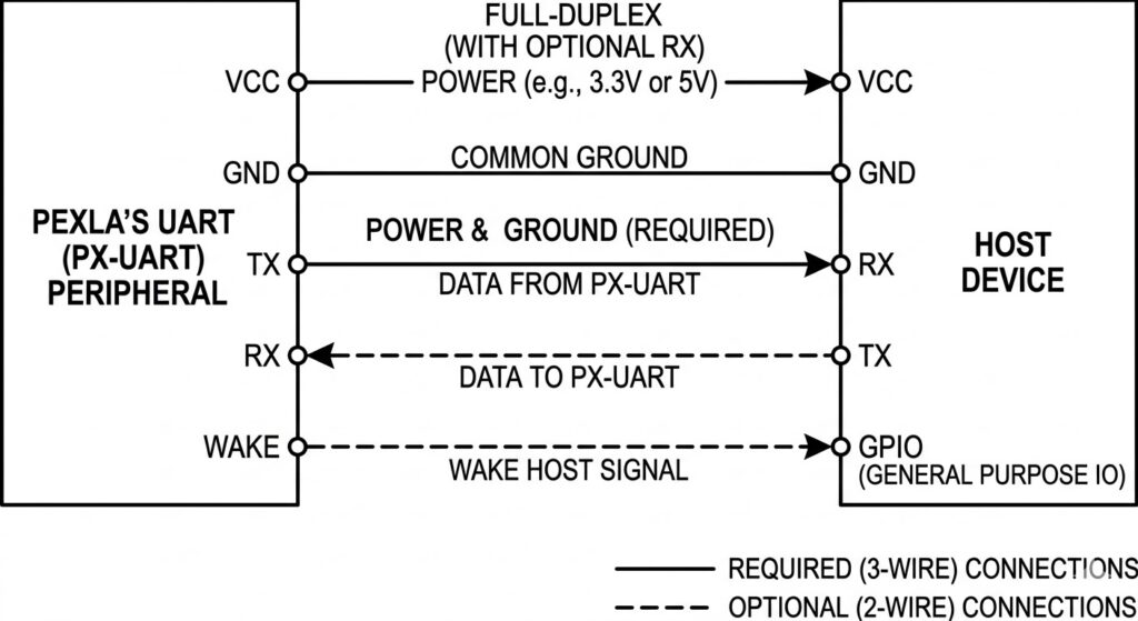 * Pexla TX → Arduino RX (pin 0, or SoftwareSerial)